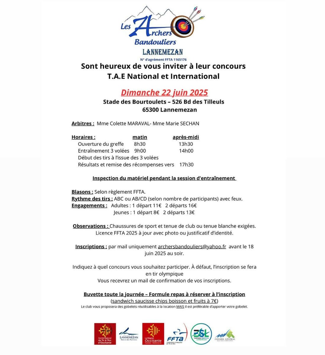 Nous vous invitons à notre concours extérieur TAE le 22 juin sur le stade des Bourtoulets à Lannemezan on vous attend nombreux.