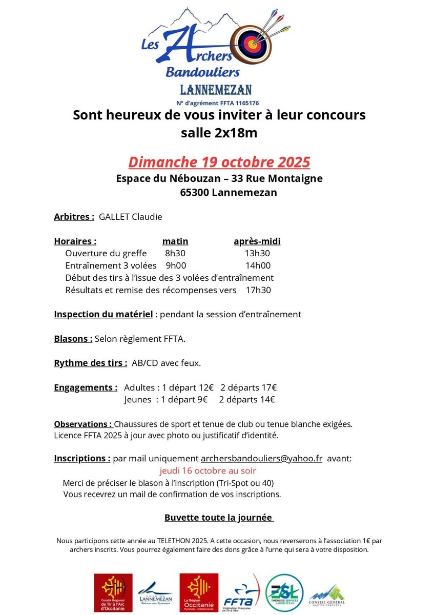 Le club organise son concours salle deux fois 18m le dimanche 19 octobre dans la salle du Nebouzan.